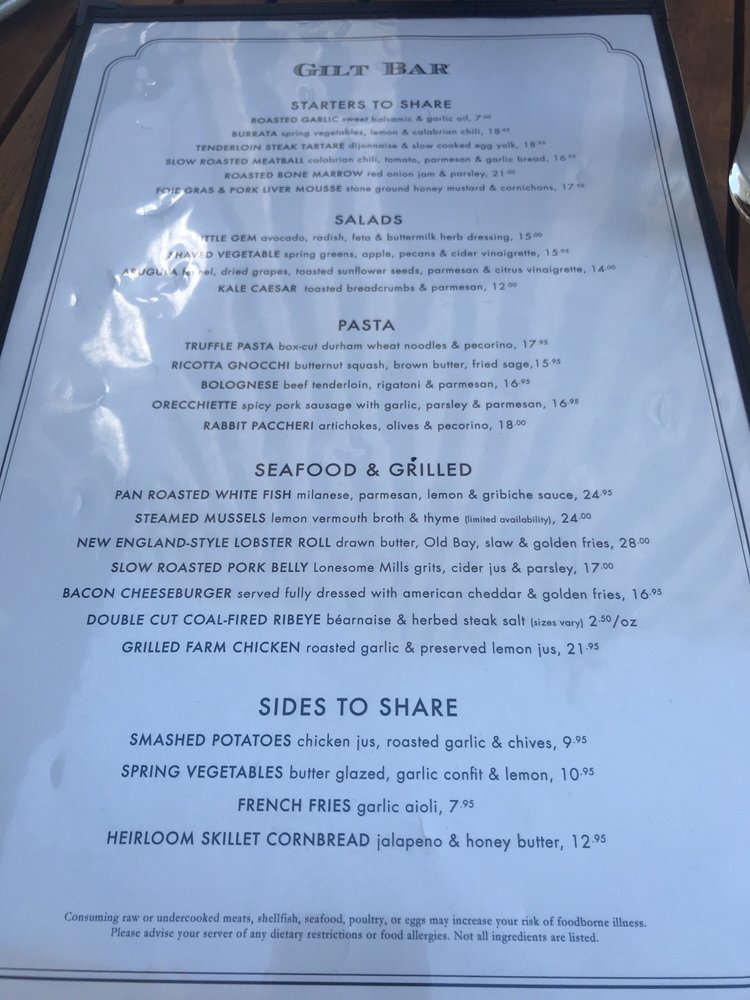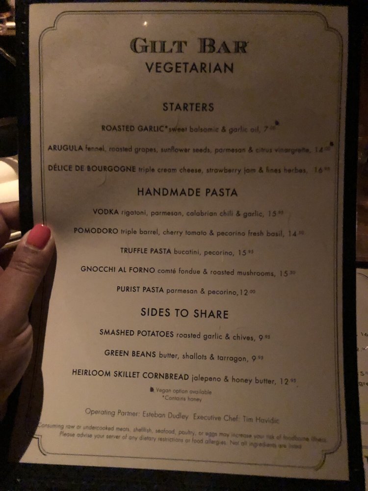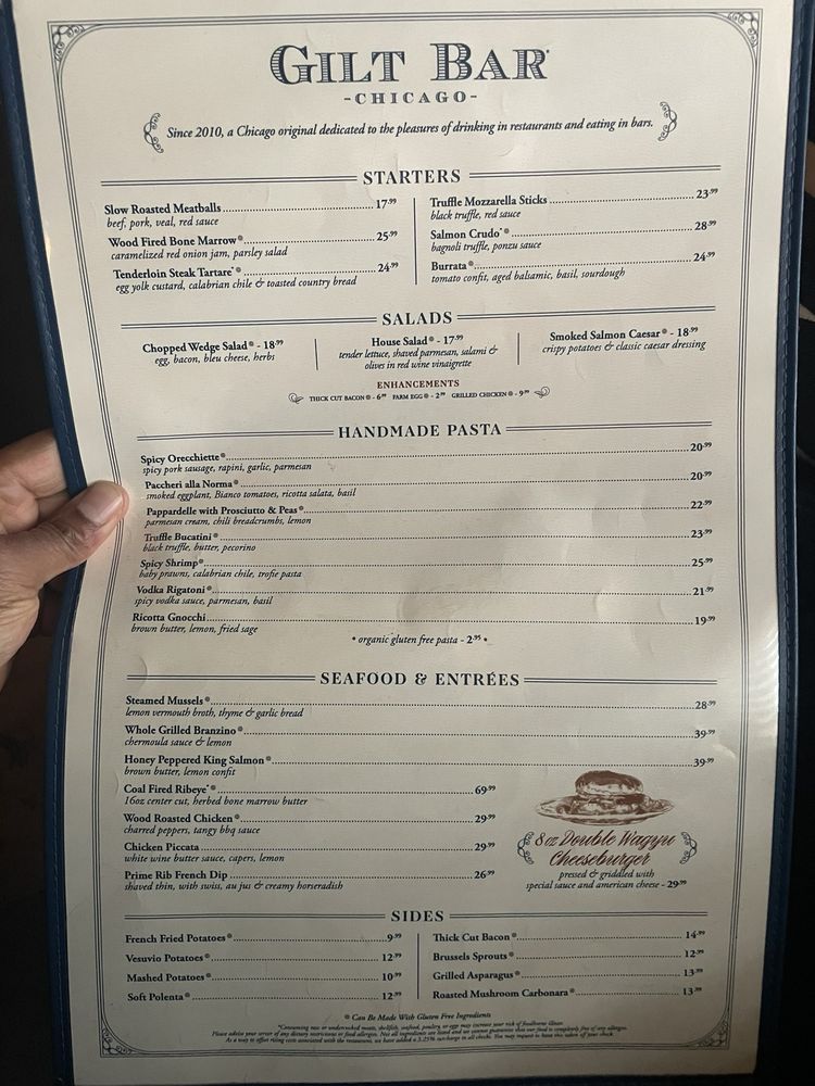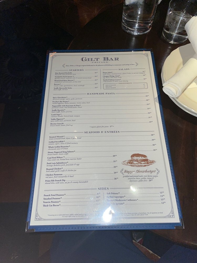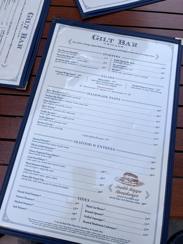 Introducing the menu at Gilt Bar, located in Chicago, you can expect a New American dining experience with a trendy and classy ambiance. The restaurant offers a variety of options including Pescatarian, Vegan, and Vegetarian choices. With a full bar, happy hour specials, and outdoor seating, Gilt Bar caters to a diverse crowd. Standout dishes like the vodka rigatoni, truffle bucatini, and smoked salmon caesar salad have received rave reviews from customers. The steak tartare and wagyu burger are also highly recommended, showcasing the restaurant's culinary prowess. Additionally, the chocolate cream pie is a must-try dessert that has left patrons dreaming about its flavor. Overall, Gilt Bar provides an intimate and elegant dining experience, perfect for special occasions or a night out with friends.